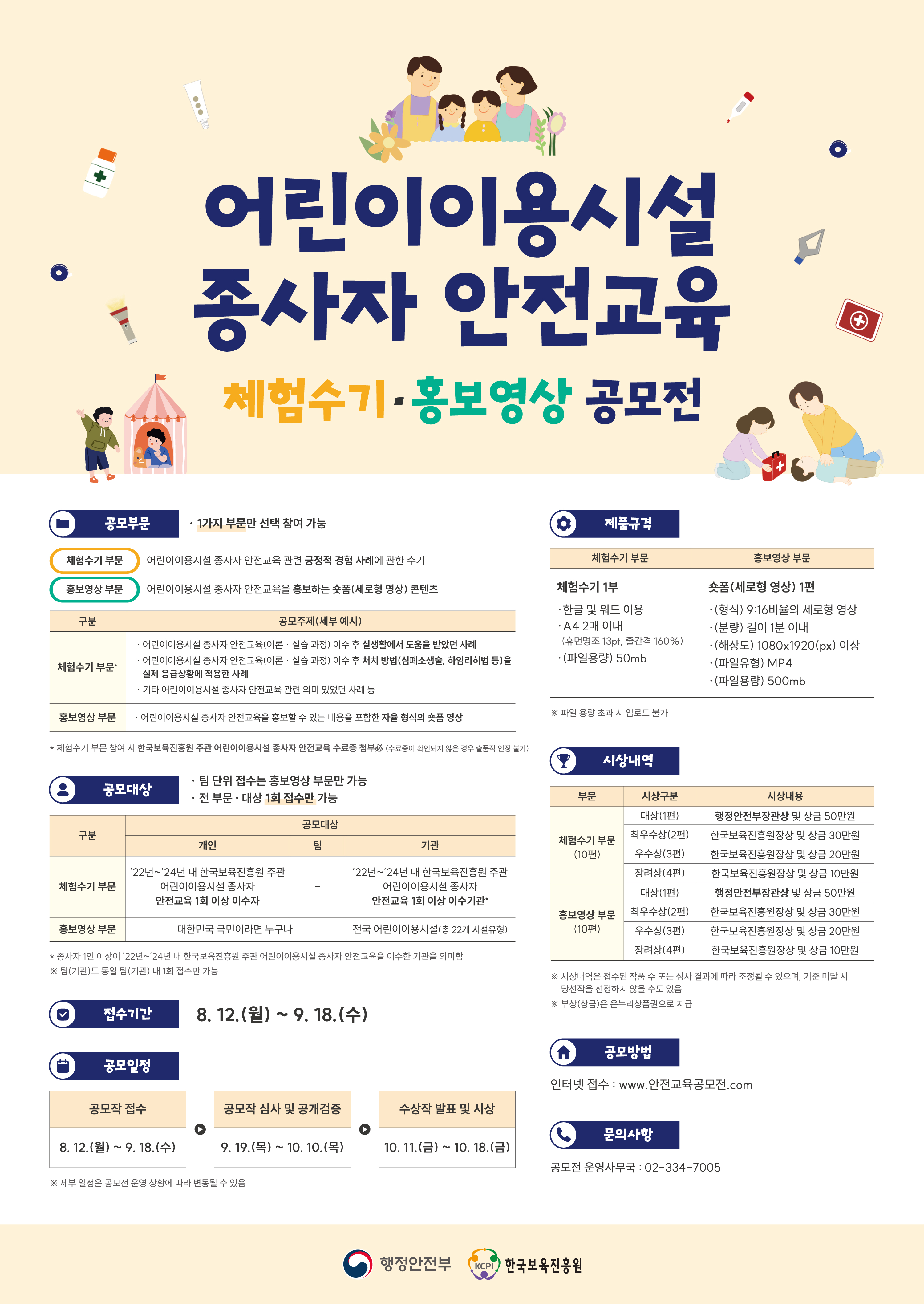 안녕하세요. 한국보육진흥원입니다. 한국보육진흥원에서는 2022년부터 행정안전부 수탁사업 ‘어린이이용시설 종사자 안전교육’을 운영하고 있습니다. 이와 관련하여 안전교육의 효과 검증 및 다각화된 홍보 방향성 모색을 위해 「어린이이용시설 종사자 안전교육 체험수기 · 홍보영상 공모전」을 개최하오니 많은 관심과 참여 바랍니다.